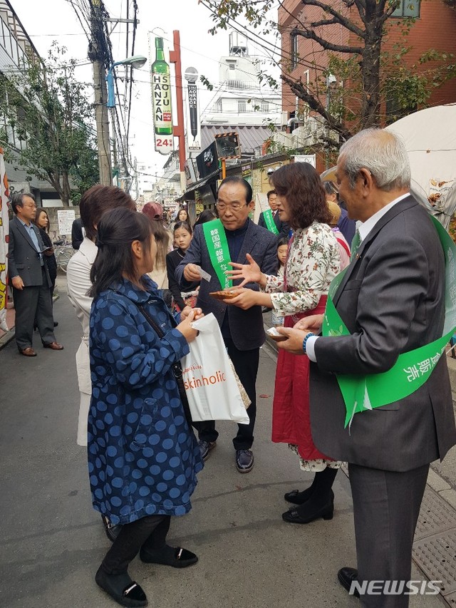 【보은=뉴시스】이성기 기자 = 지난 12일 정상혁 보은군수(가운데) 등이 일본 도쿄 신주쿠 신오쿠보 서울시장에서 보은 생대추 판촉행사를 하고 있다.2018.11.13.(사진=보은군 제공)