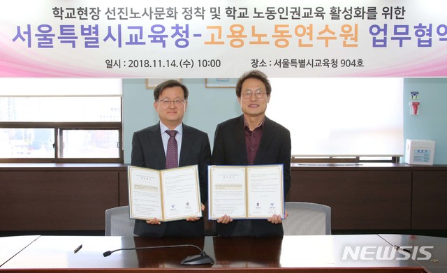 【서울=뉴시스】 조희연 서울시교육감과 전운배 고용노동연수원 원장이 14일 오전 서울 종로구 서울시교육청에서 '학교현장 노사문화정착 및 노동인권교육 활성화'를 위한 업무협약을 체결하고 기념촬영을 하고 있다. 2018.11.14. (사진=서울시교육청 제공)