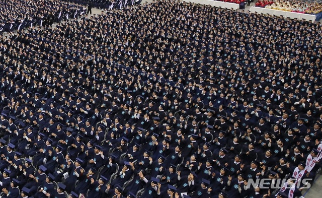 【인천=뉴시스】 김민수 인턴기자 = 18일 오후 경기도 일산에서 시온기독교선교센터 108기 수료식이 개최되고 있다. 이날 수료식에서는 6개월 과정의 성경 공부를 마치고 수료시험에 통과한 5949명의 수료생이 배출됐다. 2018.11.18. [email protected]