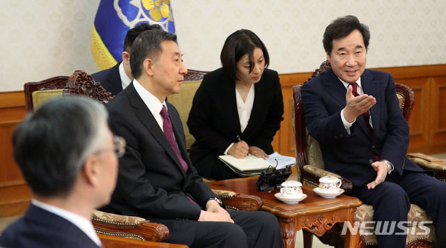 【서울=뉴시스】박주성 기자 = 이낙연 국무총리가 19일 오후 서울 세종로 정부서울청사에서 왕용 중국 국무위원을 접견해 환담을 나누고 있다. 2018.11.19.