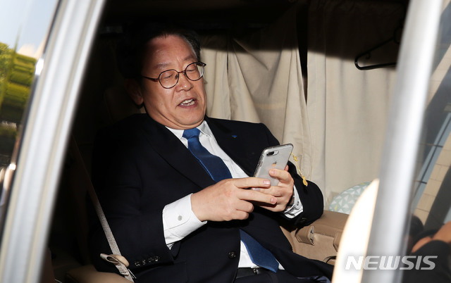 【서울=뉴시스】홍효식 기자 = 이재명 경기도 지사가 20일 오후 서울 여의도 국회 도서관에서 열린 2018 국회 철도정책 세미나를 마친 뒤 차량에 올라 휴대폰을 보고 있다. 2018.11.20.