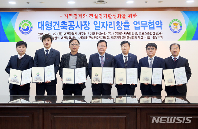 【대전=뉴시스】조명휘 기자 = 22일 대전 서구청 중회의실에서 장종태(가운데) 구청장과 건설시공사, 전문건설협회 대전시회, 대전건설건축자재협회, 기계설비건설협회 대전세종충남도회 등이 일자리 창출을 위한 업무협약을 체결하고 있다. 2018.11.22. (사진= 서구청 제공)