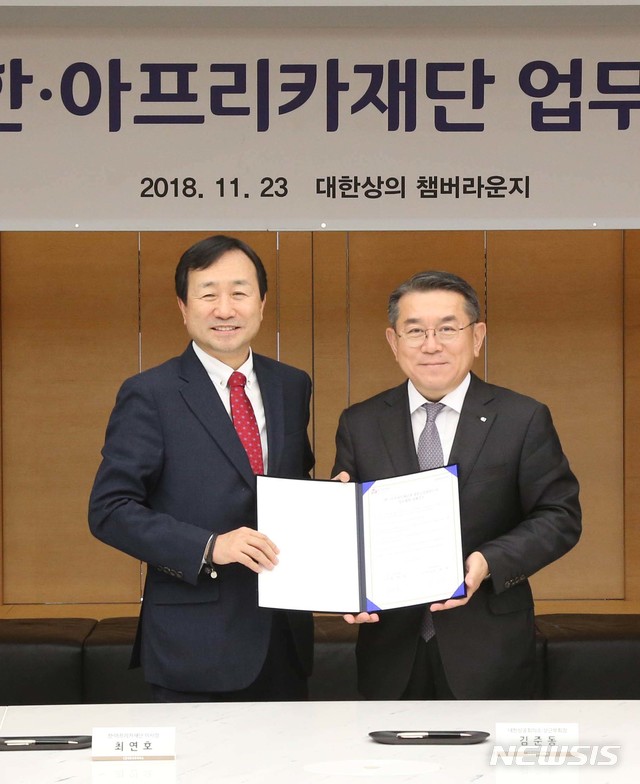 【서울=뉴시스】 김준동(오른쪽) 대한상의 상근부회장과 최현호 한-아프리카재단 이사장이 23일 서울 남대문 대한상의회관에서 양 기관간 협력을 위한 업무협약을 체결한 뒤 기념촬영을 하고 있다. 2018.11.23. (사진=대한상공회의소 제공)
