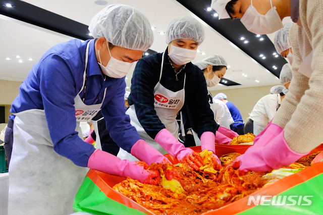 【서울=뉴시스】 일화 임직원들이 26일 서울 강동구 상일동 일화 본사에서 사랑 나눔 김장 봉사를 하고 있다. 2018.11.27. (사진=일화 제공)
