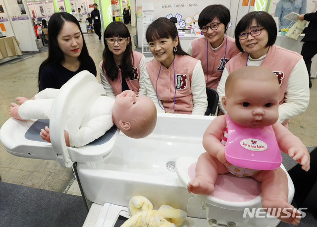 【서울=뉴시스】김진아 기자 = 6일 서울 강남구 코엑스에서 열린 2018 대한민국 지식재산대전에서 참석자들이 포프베베의 '다기능 아기비데'를 관람하고 있다.