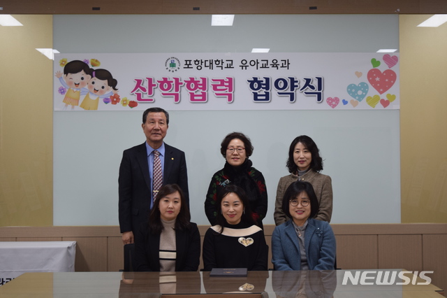 【포항=뉴시스】강진구 기자 = 포항대학교(총장 한홍수) 유아교육과는 7일 오후 교내 성실관에서 아띠유치원과 시립연일어린이집 원장 등 관계자 6명이 참석한 가운데 상호업무협력 강화를 위한 산학협력 협약식을 가졌다.이들은 이번 산학협력 협약을 통해 기관이 필요로 하는 실무형 인재를 양성하고 지역 유아교육 발전을 위한 협력체계를 구축하기로 했다.2018.12.08.(사진=포항대학교 제공)