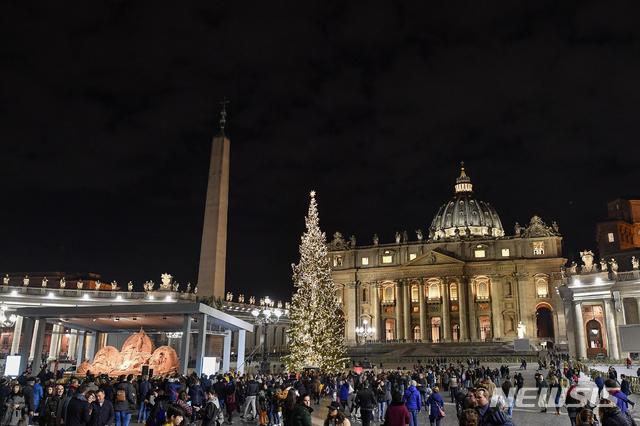 【바티칸=AP/뉴시스】7일(현지시간) 바티칸의 성 베드로 광장에서 크리스마스트리 점등식이 열려 함께 설치된 모래성 구유(왼쪽 아래)와 함께 빛을 밝히고 있다.
