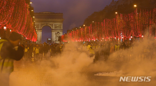 8일 프랑스 파리 샹제리제 거리가 최루가스로 뒤덮이고 있다.