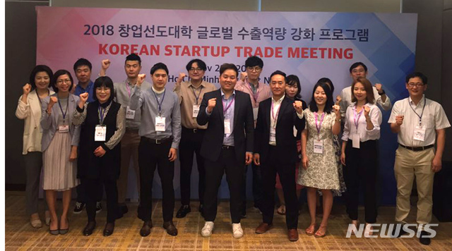 【대전=뉴시스】유순상 기자 = 대전 한밭대는 11일 교내 창업아이템사업화 수혜기업들이 베트남 호치민시에서 현지기업들과 글로벌 진출 업무협약을 체결했다고 밝혔다. 대전지역 창업선도대학 연합으로 진행된 '글로벌 수출역량 강화 프로그램'에 참가한 지역대학 소속 7개 기업으로 관계자들이 기념촬영을 하고 있다.2018.12.11.(사진=한밭대 제공)
