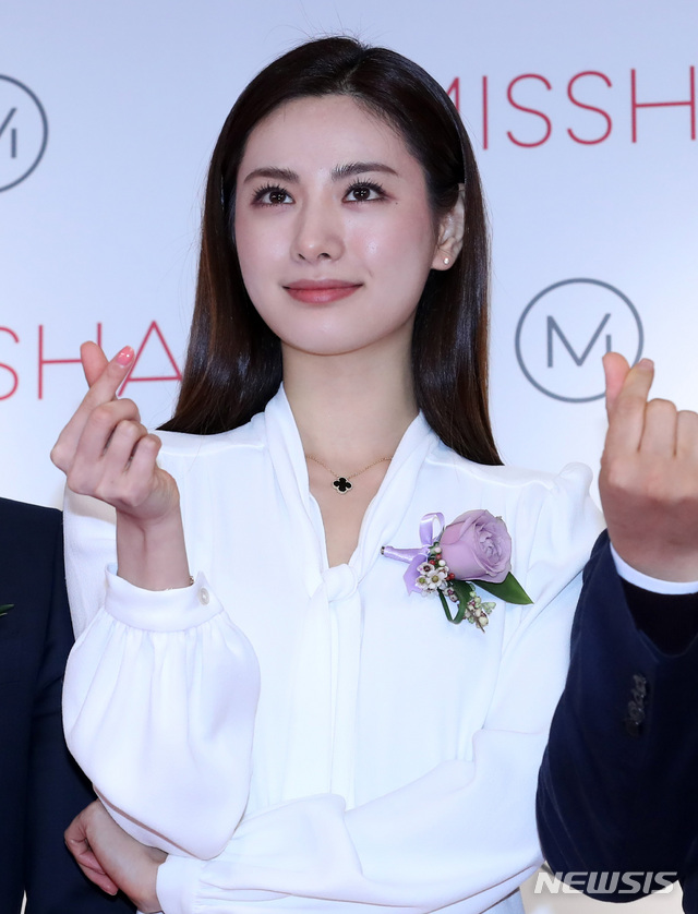 【서울=뉴시스】이영환 기자 = 13일 오후 서울 중구 명동 미샤 메가 스토어에서 열린 오픈식에서 미샤 모델인 가수 겸 배우 나나가 손가락 하트를 만들어 보이고 있다. 2018.12.13.
