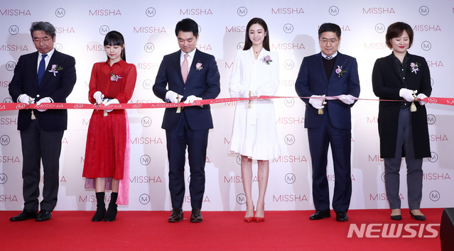 【서울=뉴시스】이영환 기자 = 13일 오후 서울 중구 명동 미샤 메가 스토어에서 열린 오픈식에서 한상만(왼쪽부터) 사외이사, 미샤 모델 전소니, 이해준 대표, 미샤 모델 나나, 조영한 영업전무, 유효영 마케팅전무가 테이프커팅을 하고 있다. 2018.12.13.