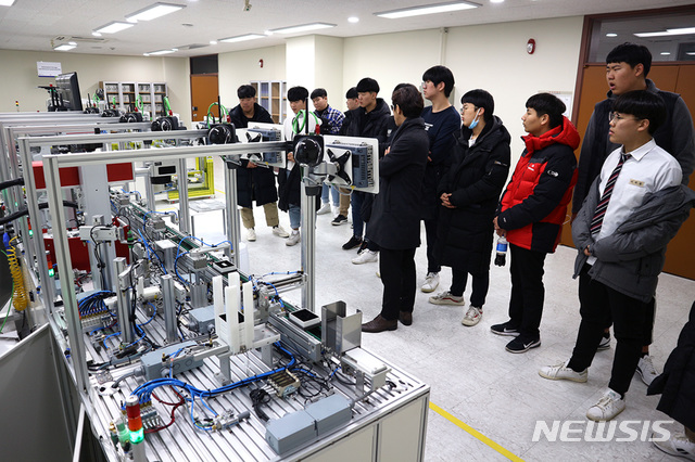 【대전=뉴시스】유순상 기자 = 한밭대는 23일 'SSR(School Start-up Relay)시스템' 일환으로 교내에서 비즈쿨-대학 연계 기업가정신 현장탐방을 실시하고 있다고 밝혔다. 경북 영주고 학생들이 스마트팩토리 센터를 견학하고 있다.2018.12.23.(사진=한밭대 제공)