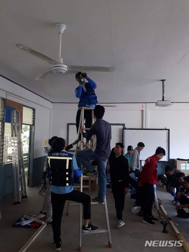 【천안=뉴시스】이종익 기자 = 충남 천안의 코리아텍 학생 30명이 지난 24일부터 라오스 루앙프라방 직업기술대학과 뻥캄고등학교에서 봉사활동에 나선 가운데 30일 현지에서 인터넷 활용 공간 조성을 위한 네트워크와 전기공사 등을 진행하고 있다. 2018.12.31. (사진=코리아텍 제공)