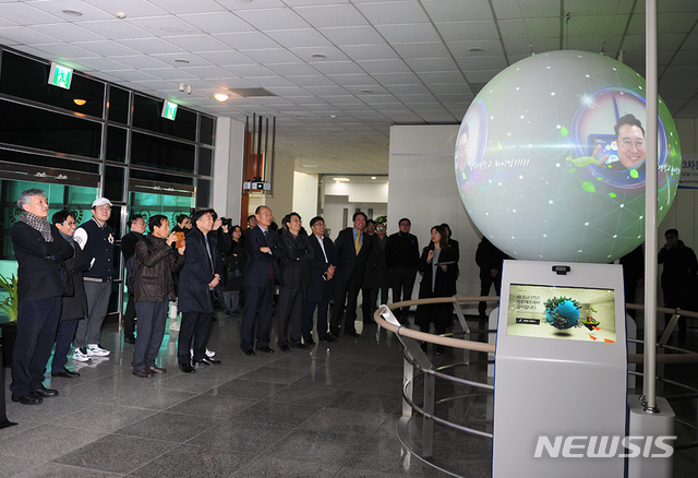 【대전=뉴시스】유순상 기자 = 7일 대전 충남대 박물관 1층 로비에서 '지구과학현상 3차원 투영시스템'이 문을 열어 참석자들이 관람을 하고 있다. 지구를 포함한 행성의 대기와 해양, 지질 및 천문우주 현상을 구(球)위에 3차원 영상으로 표출한 최첨단 가시화 시스템이다. 2019.01.07.(사진=충남대 제공)