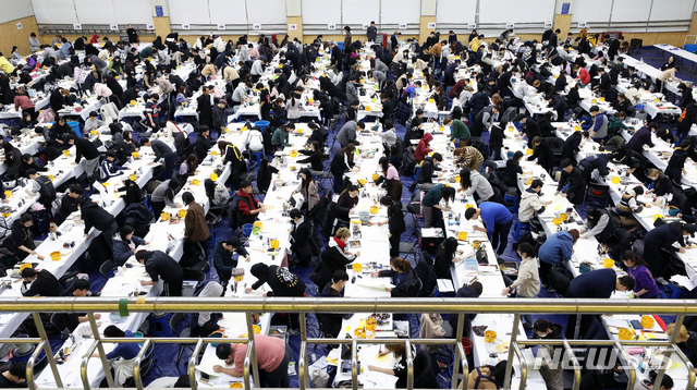 【서울=뉴시스】김병문 수습기자 = 8일 오전 서울 노원구 삼육대학교 체육관에서 치러진 2019학년도 정시모집 미술 실기고사에서 아트앤디자인학과 수험생들이 실기를 보고 있다.