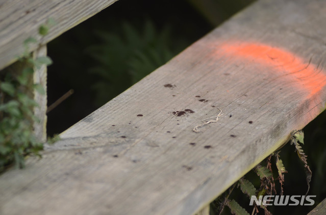 【매그놀리아=AP/뉴시스】8일(현지시간) 미 미시시피주 매그놀리아의 에리카 홀의 집 현관 계단에 경찰이 핏자국을 따라 뿌려놓은 주황색 페인트가 보이고 있다.