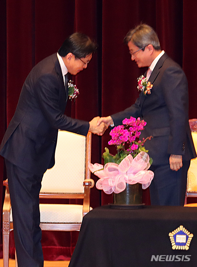 【고양=뉴시스】박주성 기자 = 김명수 대법원장과 박상기 법무부장관이 14일 오후 경기도 고양시 일산동구 사법연수원 대강당에서 열린 '제48기 사법연수생 수료식'을 마친 후 인사를 나누고 있다. 2019.01.14.