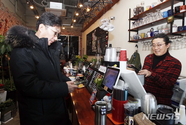 【서울=뉴시스】25일 이창우 동작구청장이 서울 동작구 상도동 한 커피전문점을 찾아 휴대폰을 이용, 소상공인을 위한 결재수수료 제로인 제로페이로 결제하고 있다. 2019.01.25. (사진=동작구 제공)