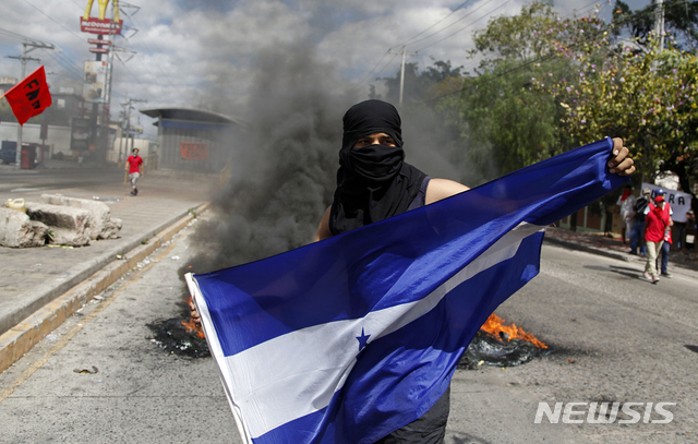 【테구시갈파=AP/뉴시스】27일(현지시간) 온두라스 수도 테구시갈파에서 후안 오를란도 에르난데스 대통령 집권 1주년을 맞아 이에 반대하는 시위가 열려 얼굴을 가린 남성이 국기를 들고 시위하고 있다.