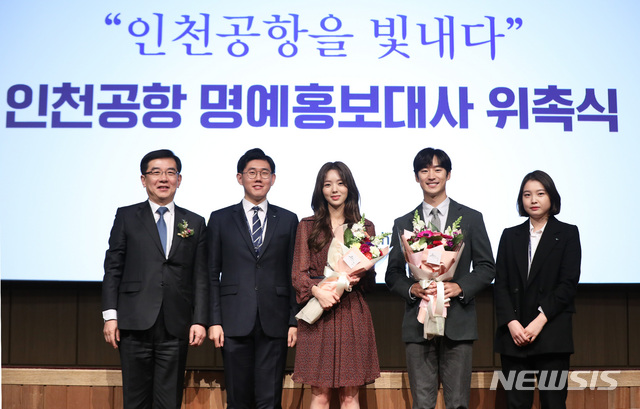 【인천공항=뉴시스】이윤청 수습기자 = 배우 채수빈(가운데)와 이제훈(오른쪽 두번째)이 31일 오전 인천국제공항공사에서 열린 '인천국제공항공사 창립 제20주년 기념식'에서 인천공항 명예홍보대사로 위촉된 후 기념촬영을 하고 있다.