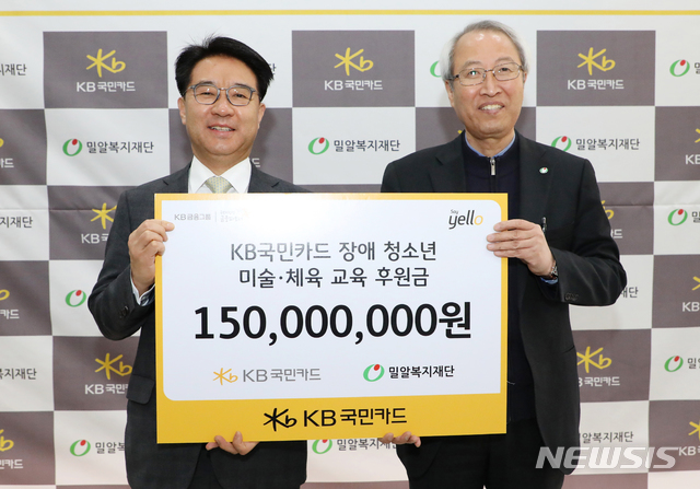 【서울=뉴시스】 31일 오후 서울 종로구 KB국민카드 본사에서 이동철 KB국민카드 사장(왼쪽)이 정형석‘밀알복지재단’ 상임대표에게 장애 청소년 미술·체육 활동 지원을 위한 후원금 1억 5천만원을 전달하고 있다. 2019.02.01. (사진=KB국민카드 제공)