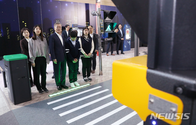 【부산=뉴시스】전신 기자 = 문재인 대통령이 13일 부산 해운대구 벡스코에서 열린 스마트시티 전시에서 대경이엔씨의 스마트 신호등 및 횡단보도를 체험하고 있다. 2019.02.13.