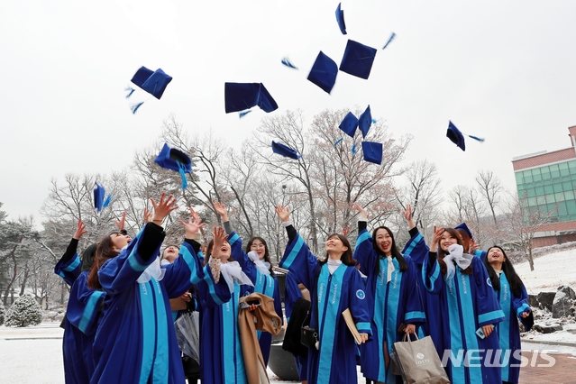 【서울=뉴시스】최진석 기자 = 15일 오전 서울 노원구 삼육대에서 열린 2018학년도 전기 학위수여식에서 졸업생들이 학사모를 던지고 있다.