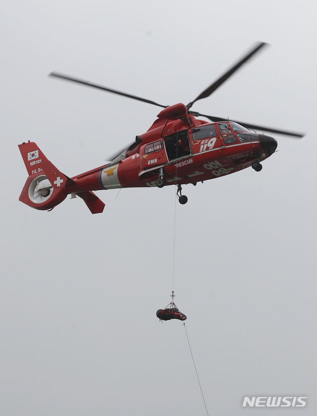 【남양주=뉴시스】조수정 기자 = 경기 남양주시 중앙119구조본부 수도권 119특수구조대에서 열린 훈련 공개 행사에서 항공구조대가 헬기 호이스트 구조 시연을 하고 있다. 이날 훈련 시연은 소방청 명예소방관인 배우 박해진과 함께 열렸다. 박해진은 16부작 로맨스 드라마 '시크릿(가제)'에서 레드라인 인베스트먼트 본부장 겸 미령 119 특수구조대 항공구조대원인 강산혁으로 출연할 예정이다. 2019.02.15. [email protected]