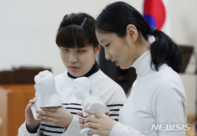【서울=뉴시스】김진아 기자 = 한빛맹학교 졸업생들이 18일 서울 강북구 한빛맹학교 3D 졸업사진 전달식에서 자신의 얼굴을 3D 프린터로 만든 흉상을 만져보고 있다. 2019.02.18.
