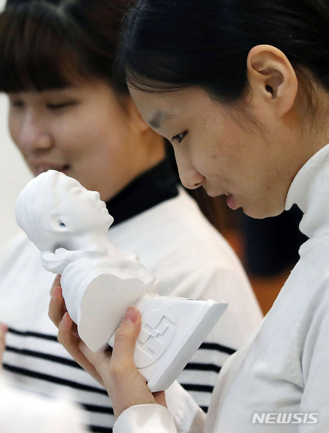 【서울=뉴시스】김진아 기자 = 한빛맹학교 졸업생들이 18일 서울 강북구 한빛맹학교 3D 졸업사진 전달식에서 자신의 얼굴을 3D 프린터로 만든 흉상을 만져보고 있다. 2019.02.18.