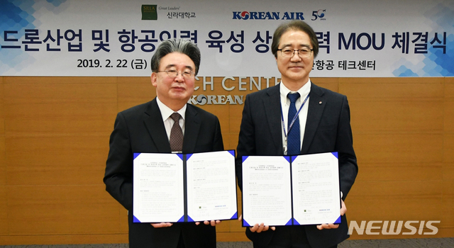 【부산=뉴시스】 하경민 기자 = 신라대는 22일 대한항공과 미래 공공용 드론산업 및 항공인력 육성을 통한 전문 인력양성을 위한 산학 협력 업무협약을 체결했다고 밝혔다. 2019.02.22. (사진=신라대 제공)