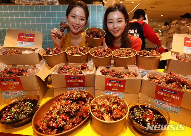 【서울=뉴시스】이영환 기자 = 3일 오전 서울 중구 롯데백화점 본점 식품관 수원왕갈비통닭 팝업 스토어에서 모델들이 제품을 선보이고 있다.