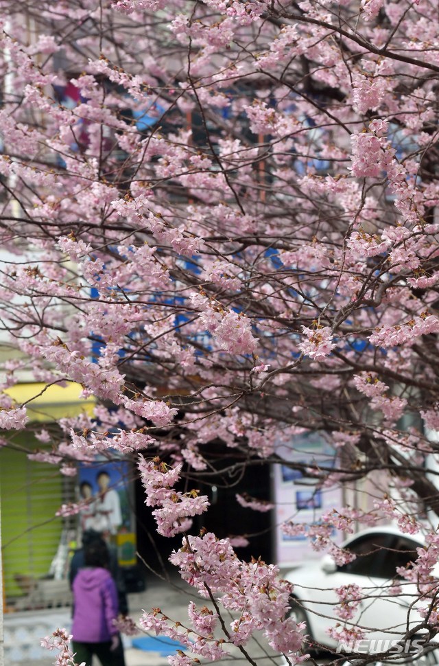 【부산=뉴시스】 하경민 기자 = 완연한 봄날씨를 보인 3일 부산 수영구 배화학교에서 벚나무가 꽃망울을 활짝 터뜨려 봄소식을 전하고 있다. 2019.03.03. [email protected]