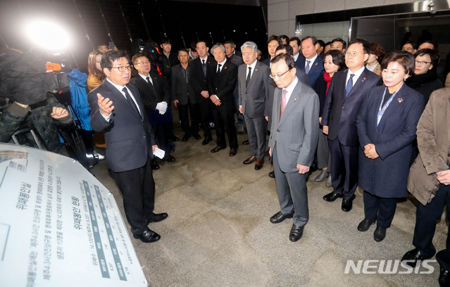 【제주=뉴시스】우장호 기자 = 이해찬 더불어민주당 대표 등 지도부가 6일 오전 제주시 봉개동 4·3 평화공원 위패봉안소를 찾아 참배 후 양조훈(왼쪽) 4·3 평화재단 이사장의 설명을 듣고 있다. 2019.03.06.