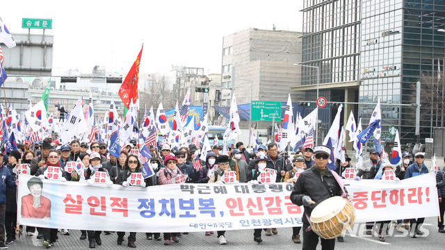 【서울=뉴시스】박미소 수습기자 = 박근혜대통령무죄석방1천만국민운동본부 등 참석자들이 10일 오후 서울 중구 서울역 앞에서 열린 박 전 대통령의 석방 촉구 집회를 마친 후 헌법재판소로 향하고 있다. 2019.03.10.