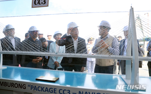 【반다르스리브가완(브루나이)=뉴시스】전신 기자 = 문재인 대통령이 11일 반다르스리브가완 템부롱 대교 건설 현장을 방문해 교량 모형을 바라보며 윤태섭 대림산업 부사장의 설명을 듣고 있다.