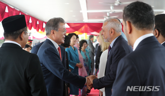 【쿠알라룸푸르(말레이시아)=뉴시스】전신 기자 = 말레이시아를 국빈 방문 중인 문재인 대통령이 13일 쿠알라룸푸르 국회의사당 광장에서 열린 공식환영식에서 말레이시아 측 인사들과 악수하고 있다. 2019.03.13.