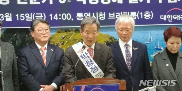 【통영=뉴시스】신정철 기자 =경남 통영고성 국회의원 보궐선거에 나선 대한애국당 박청정(75) 후보는 조원진 당 대표가 참석한 가운데 15일 통영시청 브리핑룸에서 출마기자회견을 열고 “국가정체성을 바로세워 다시 한번 번영하는 대한민국을 만드는 일에 동참하겠다”고 말했다.2019.03.15.