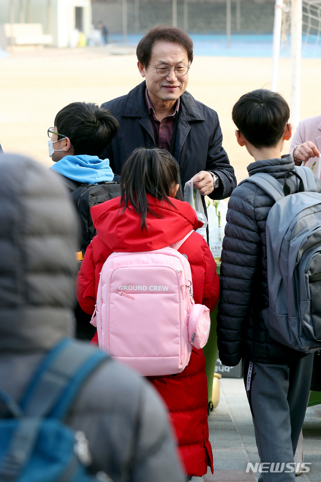 【서울=뉴시스】김병문 수습기자 = 조희연 서울시교육감이 15일 오전 서울 마포구 아현초등학교에서 굿네이버스가 준비한 아동 권리 화분을 등교하는 학생들에게 나누어 주고 있다. 2019.03.15.