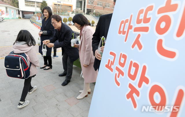 【서울=뉴시스】김병문 수습기자 = 조희연(왼쪽 두번째) 서울시교육감이 15일 오전 서울 마포구 아현초등학교에서 굿네이버스가 준비한 아동 권리 화분을 등교하는 학생들에게 나누어 주고 있다. 2019.03.15.