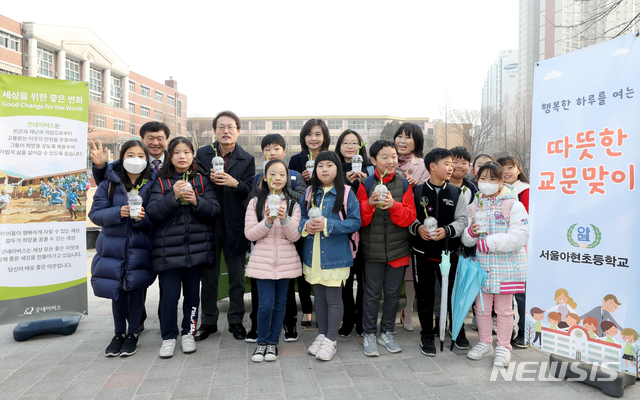【서울=뉴시스】김병문 수습기자 = 조희연(왼쪽 네번째) 서울시교육감이 15일 오전 서울 마포구 아현초등학교에서 굿네이버스가 준비한 아동 권리 화분을 들고 학생들과 기념촬영하고 있다. 2019.03.15.