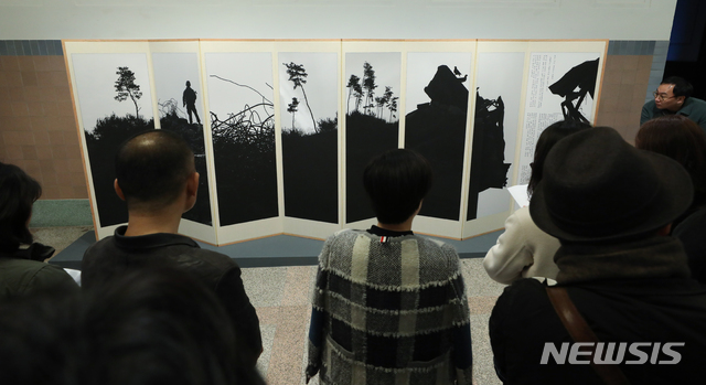 【서울=뉴시스】조수정 기자 = 'DMZ' 전시 개막을 하루 앞둔 20일 오전 서울 중구 통일로 1번지 문화역서울284에서 열린 기자간담회에서 참석자들이 사진작가 노순택의 신작 '남풍리 남일당 남지피'에 대한 설명을 듣고 있다. 이번 전시는 문화체육관광부 주최, 한국공예디자인문화진흥원 주관, 광주비엔날레 협력으로 5월 6일까지 열린다. 2019.03.20. [email protected]