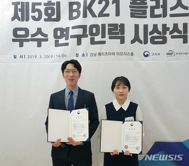 【대전=뉴시스】유순상 기자 = 20일 서울 강남 메리츠타워에서 열린 한국연구재단의 '제5회 BK21 플러스 우수 연구인력 시상식'에서 충남대 융합의과학 전문인력양성사업단 김진경(오른쪽) 박사와 미래우주지질탐사사업단 정용식 박사(수료)가 표창장을 받고 기념촬영을 하고 있다. 연구영역 확장에 성과를 보인 32명이 전국에서 최종 선정됐다.2019.03.21.(사진=충남대 제공)