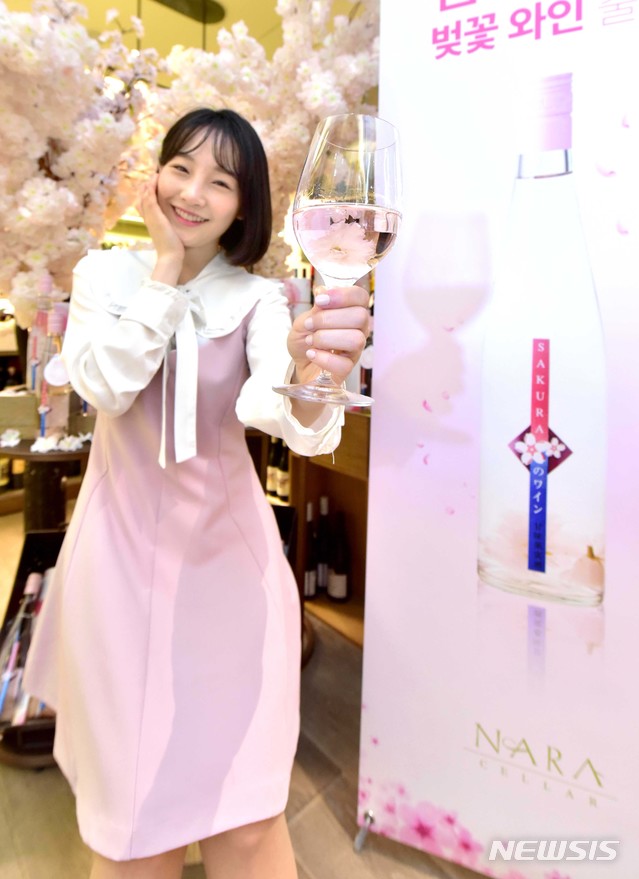 【서울=뉴시스】21일 와인 수입사 나라셀라가 서울 중구 신세계백화점 본점에 위치한 와인매장에서 매년 봄에만 한정 판매되는 '벚꽃 와인'을 선보이고 있다. 2019.03.21. (사진=나라셀라 제공)
