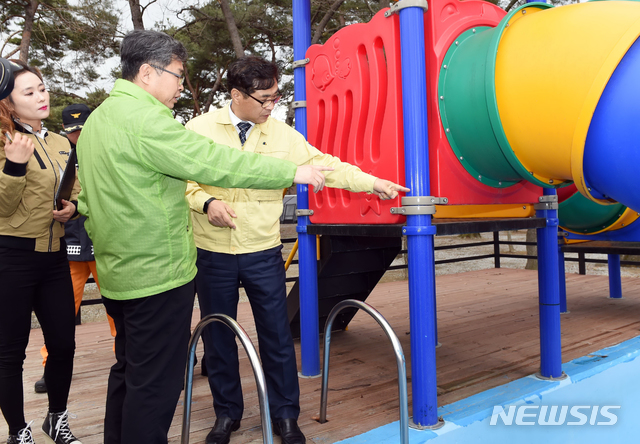 【서울=뉴시스】 고범준 기자 = 류희인 행정안전부 재난안전관리본부장이 2019년 국가안전대진단 중점사항인 ‘자율점검 실천을 통한 안전문화 확산’을 위해 21일 오후 충북 괴산군 청천면 소재 펜션을 방문해 펜션관계자들과 함께 어린이 놀이시설을 점검하고 있다. 2019.03.21. (사진=행정안전부 제공)