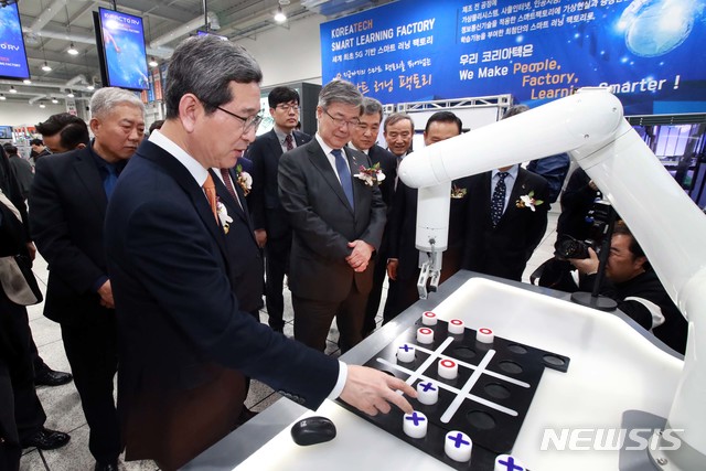 【서울=뉴시스】이재갑 고용노동부 장관이 25일 충남 천안시 한국기술교육대학교에서 열린 스마트러닝팩토리 개관식에 참석해 팩토리관을 둘러보고 있다. 2019.03.25. (사진=고용노동부 제공)