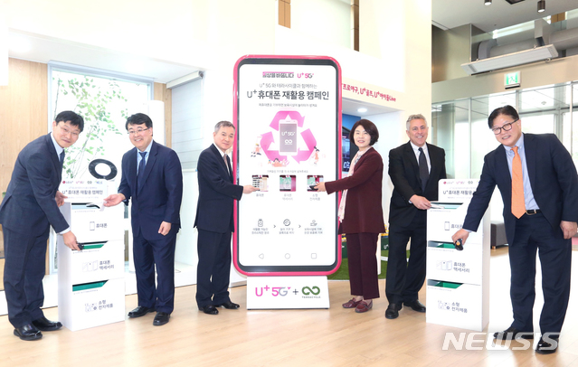 【서울=뉴시스】지난 27일 서울 LG유플러스 용산사옥에서 열린 휴대폰 재활용 기부 캠페인 전개 기념식에 참석한 LG유플러스 고객가치그룹장 조중연 상무, 테라사이클 아태지역 대표이사 에릭 카와바타(Eric Kawabata), LG유플러스 하현회 부회장, 국회 환경노동위원회 소속 한정애 더불어민주당 의원, 테라사이클 CAO(최고 관리 책임자) 리처드 펄(Richard Perl), LG유플러스 CRO 박형일 전무가 수거함에 휴대폰을 반납하고 있다. 2019.03.28. (사진=LG유플러스 제공)
