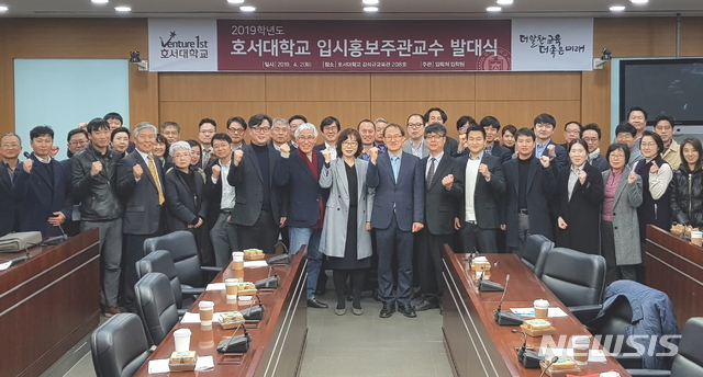 【아산=뉴시스】이종익 기자 = 충남 아산의 호서대학교(총장 이철성)는 2일 오후 아산캠퍼스에서 입시 홍보정책 수립 등에 책임교수제도를 위한 '2020학년도 호서대학교 입시홍보주관교수 발대식'을 열었다. 2019.04.03. (사진=호서대 제공)