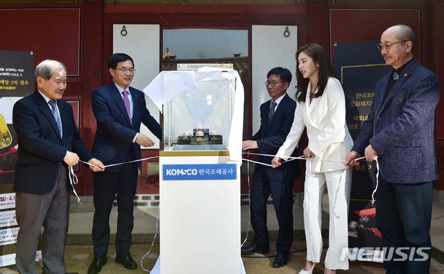 【서울=뉴시스】3일 서울 창경궁 영춘헌에서 유네스코 세계기록유산인 조선왕실의 어보 및 어책을 주제로 한 조선의 어보 기념메달 시리즈 3차 ‘정조효손은인’(正祖孝孫銀印)의 실물 공개 행사가 열린 가운데 지건길(왼쪽부터) 국외소재문화재 재단 이사장, 조용만 조폐공사 사장, 김현모 문화재청 차장, 가수 손담비, 김영희 무형문화재 옥장이 메달을 공개하고 있다. 2019.04.03. (사진=한국조폐공사 제공)