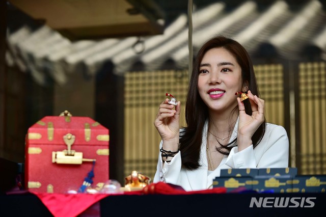 【서울=뉴시스】3일 서울 창경궁 영춘헌에서 유네스코 세계기록유산인 조선왕실의 어보 및 어책을 주제로 한 조선의 어보 기념메달 시리즈 3차 ‘정조효손은인’(正祖孝孫銀印)의 실물 공개 행사가 열린 가운데 배우 겸 가수 손담비가 포즈를 취하고 있다. 2019.04.03. (사진=한국조폐공사 제공)
